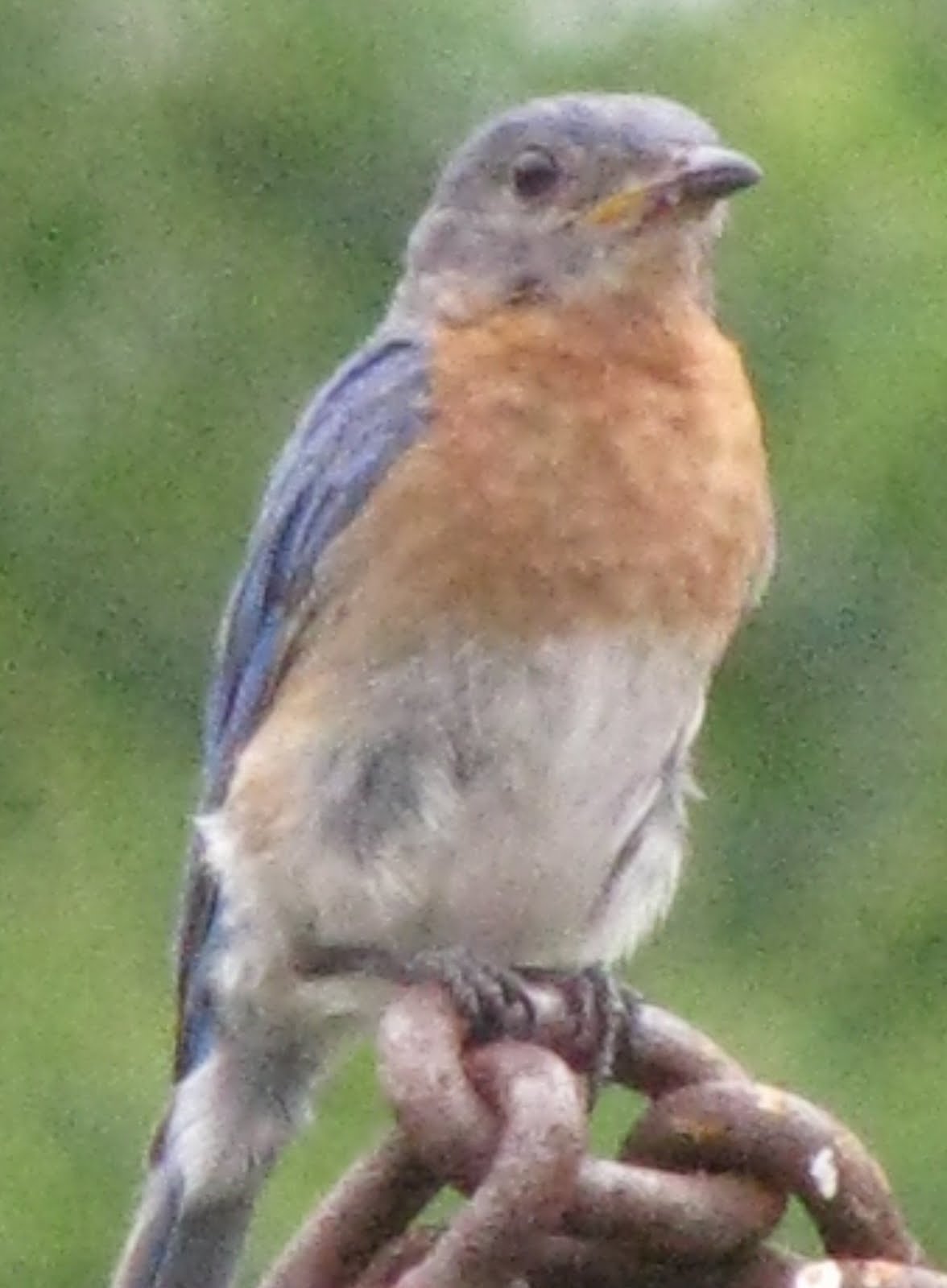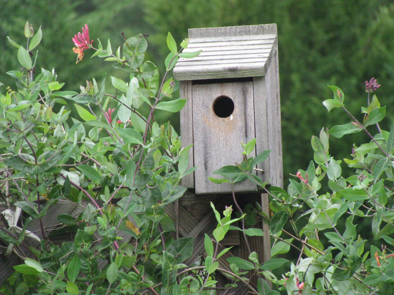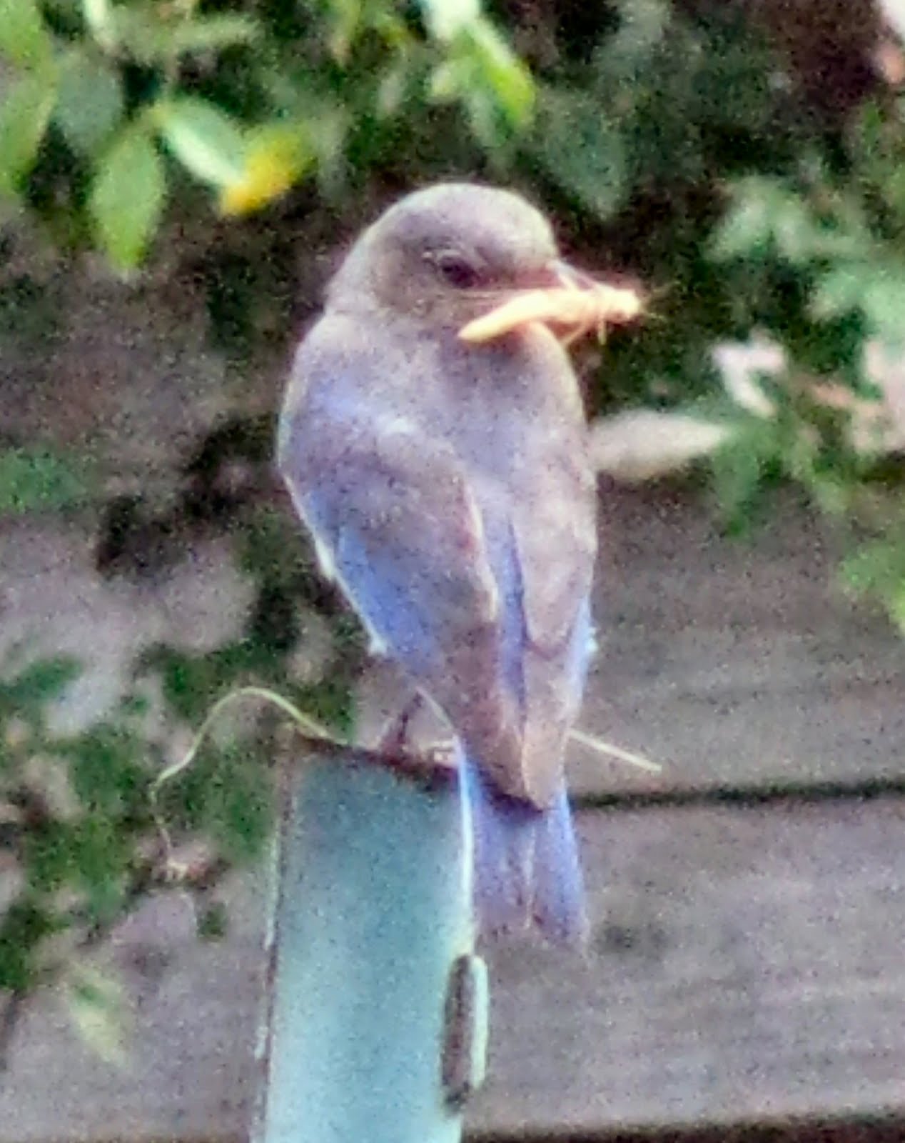 -We were happy to have a family of Eastern Bluebirds build a nest close to our office and garden. Yesterday Earl spent several hours observing Mom and Dad Bluebird trying to teach the last little one to leave the nest.