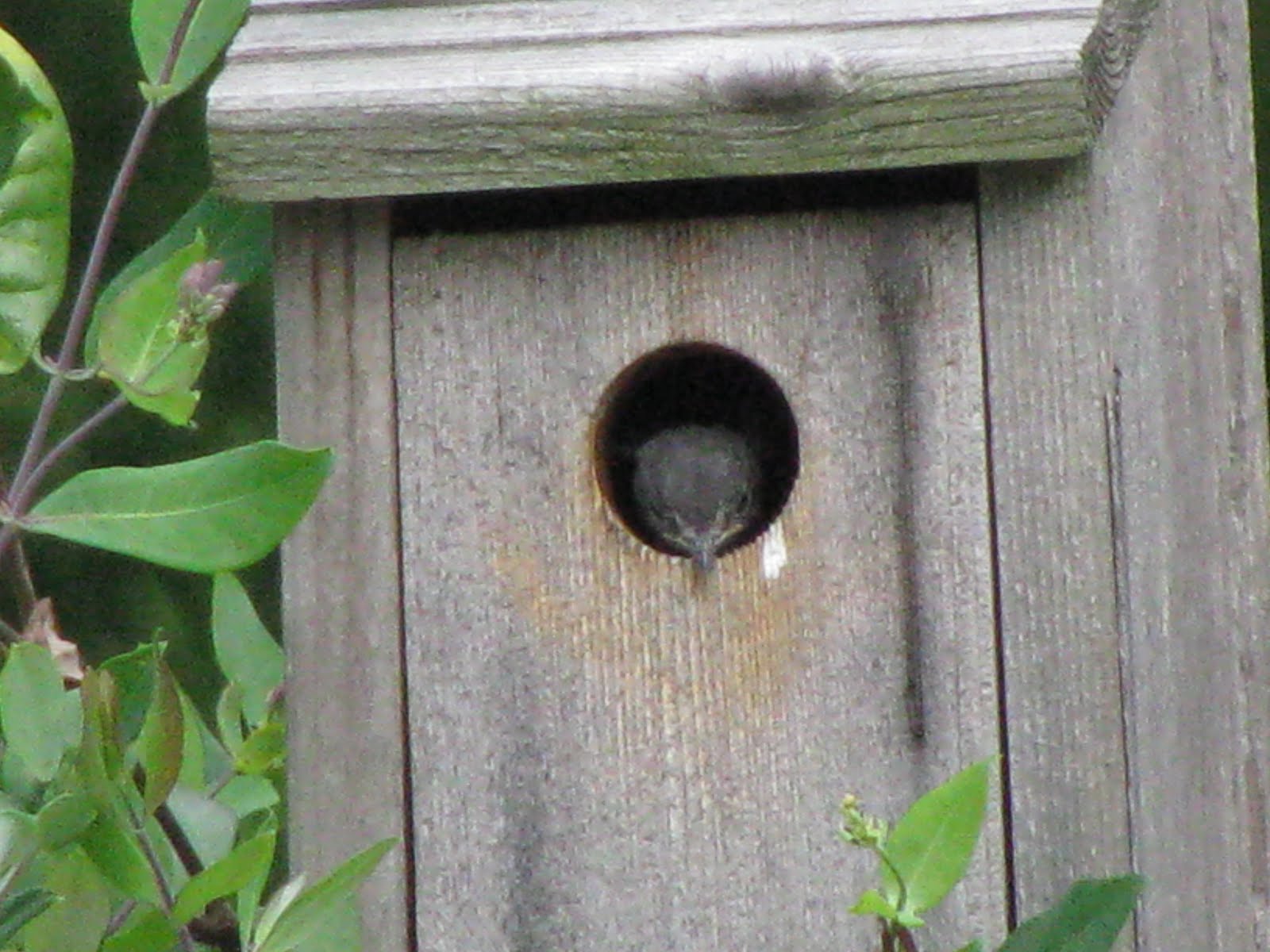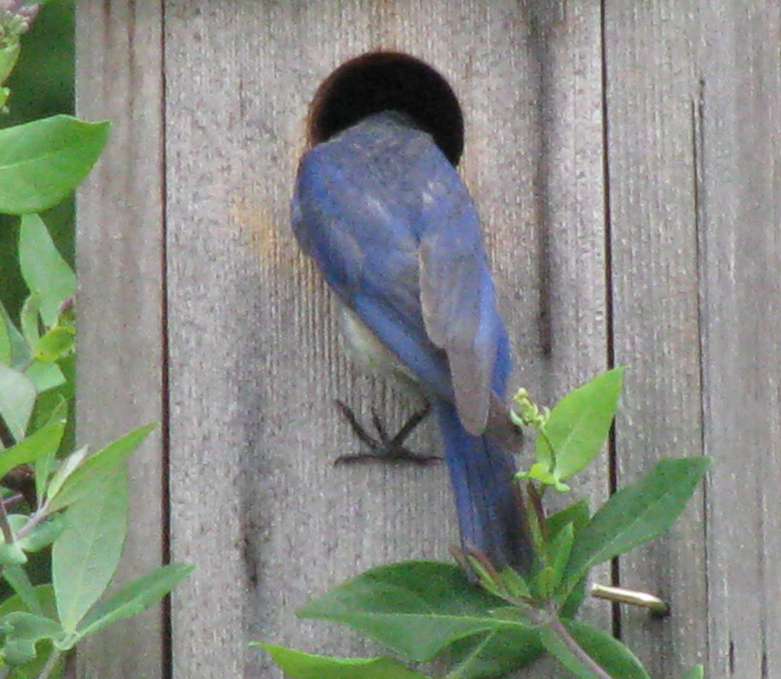 Bluebird Dad demonstrates how it’s done and is ready to offer positive reinforcement. As of this morning, all babies were out of the nest and flying on their own!