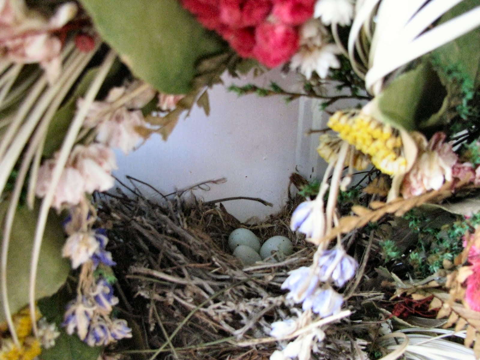 Here is a picture of the dried botanical wreath on the front door of our house. If you look closely, you can see the nest with three eggs. A house finch decided this would be the perfect spot to raise her babies! How cute is that?